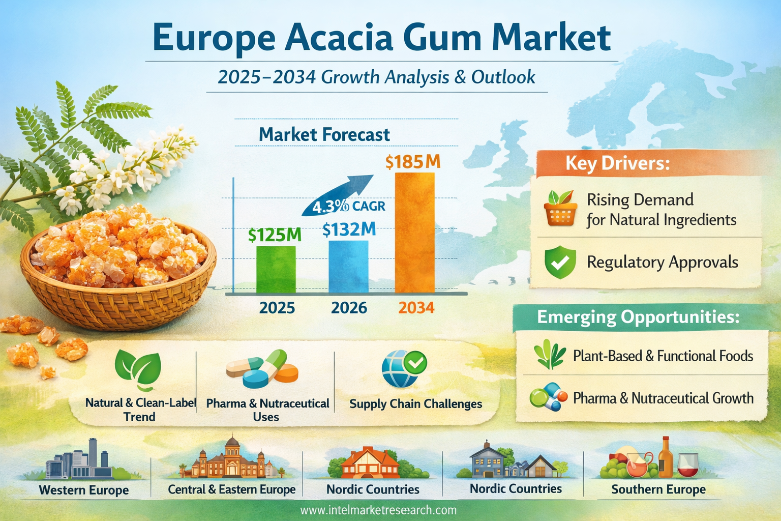 According to a new report from Intel Market Research, the Europe Acacia Gum market was valued at USD 125 million in 2025 and is projected to grow from USD 132 million in 2026 to USD 185 million by 2034, exhibiting a CAGR of 4.3% during the forecast period (2025–2034). This steady expansion is underpinned by the region's robust regulatory environment favoring natural food additives, a powerful consumer-driven shift toward clean-label products, and the increasing utilization of acacia gum across the pharmaceutical and nutraceutical industries.