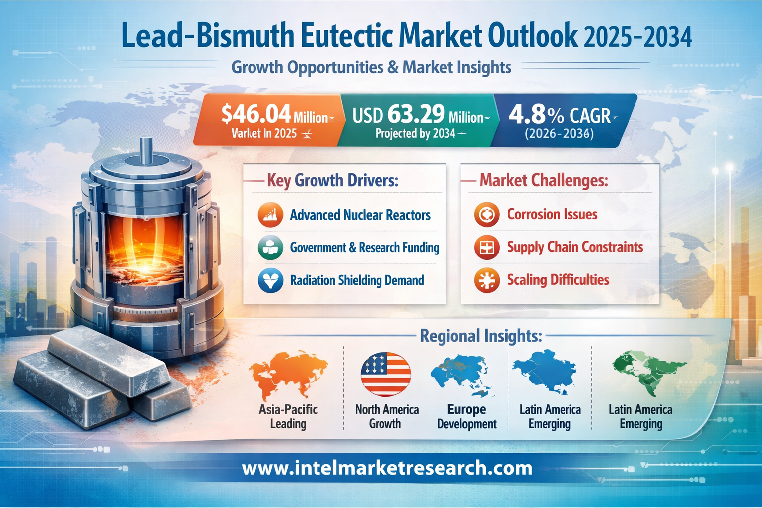 According to a new report from Intel Market Research, the global Lead-Bismuth Eutectic market was valued at USD 46.04 million in 2025 and is projected to reach USD 63.29 million by 2034, growing at a CAGR of 4.8% during the forecast period (2026–2034). This growth is propelled by growing interest in advanced nuclear energy technologies, increased investments in Generation IV reactor research, and expanding demand for high-performance radiation shielding solutions.