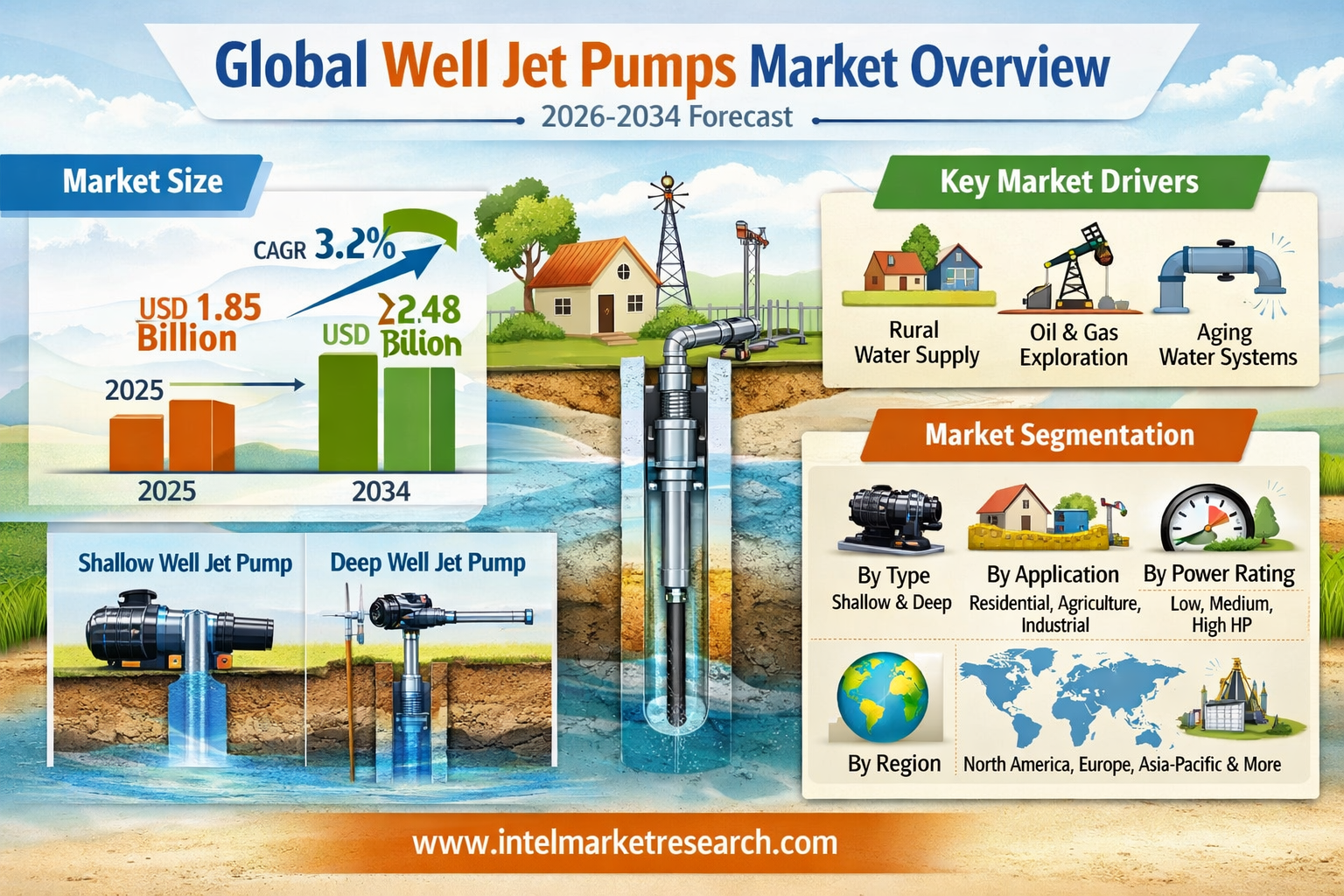 According to a new report from Intel Market Research, the global Well Jet Pumps market was valued at USD 1.85 billion in 2025 and is projected to reach USD 2.48 billion by 2034, growing at a CAGR of 3.2% during the forecast period (2026–2034). This growth is propelled by ongoing demand for reliable residential and agricultural water supply in areas without grid power or with deep water tables, increased investment in rural infrastructure development, and rehabilitation of aging water systems in emerging economies.