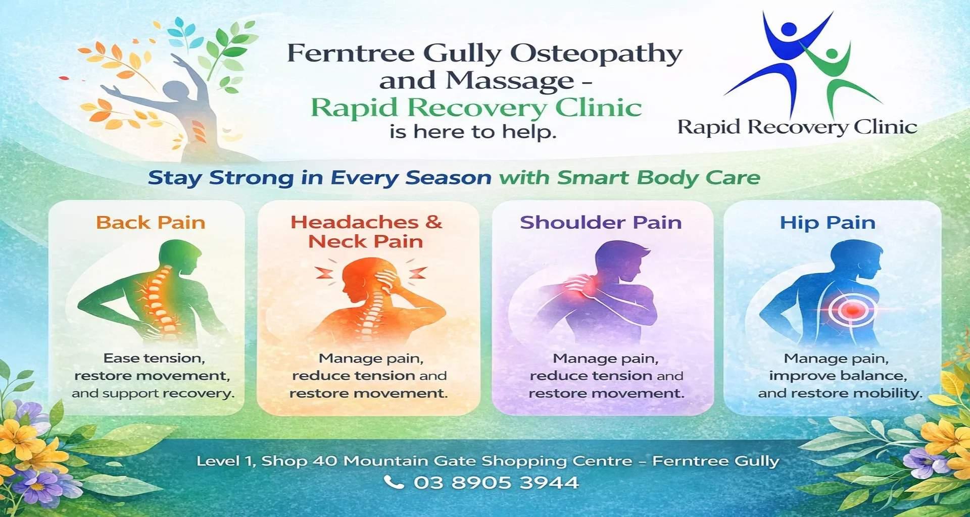 #OsteopathFerntreeGully #FerntreeGullyOsteopathy #RapidRecoveryClinic #NaturalPainRelief #MobilitySupport #BackPainCare #PostureCorrection #MuscleRecovery #HealthyMovement #WellnessCare