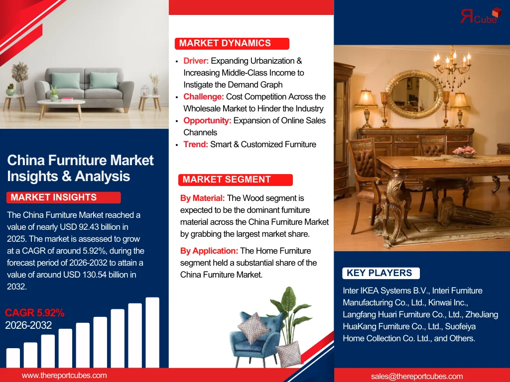 The China Furniture Market reached a value of nearly USD 92.43 billion in 2025. The market is assessed to grow at a CAGR of around 5.92%, during the forecast period of 2026-2032 to attain a value of around USD 130.54 billion in 2032.