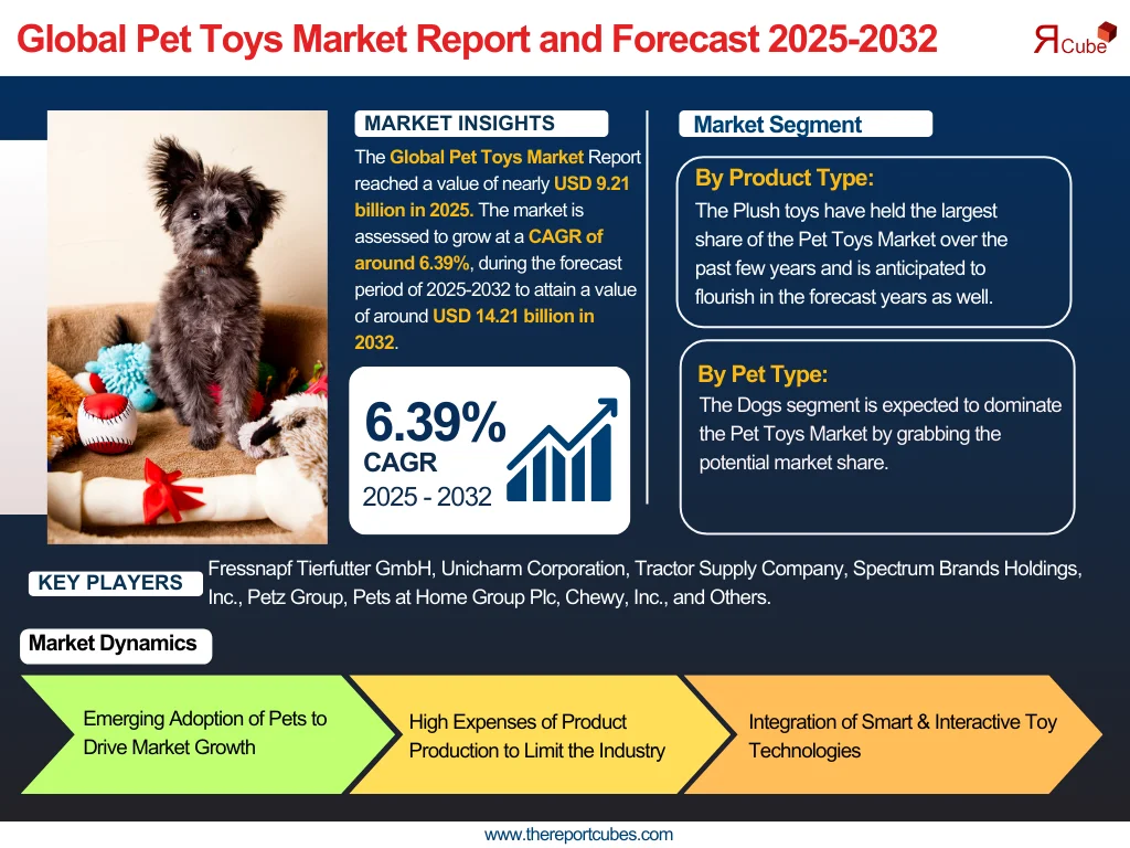 The Global Pet Toys Market Report reached a value of nearly USD 9.21 billion in 2025. The market is assessed to grow at a CAGR of around 6.39%, during the forecast period of 2025-2032 to attain a value of around USD 14.21 billion in 2032.