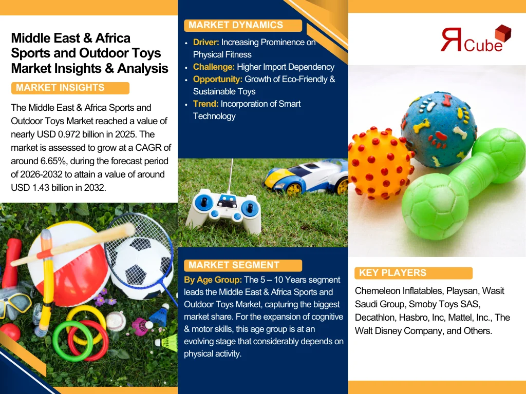 The Middle East & Africa Sports and Outdoor Toys Market reached a value of nearly USD 0.972 billion in 2025. The market is assessed to grow at a CAGR of around 6.65%, during the forecast period of 2026-2032 to attain a value of around USD 1.43 billion in 2032.