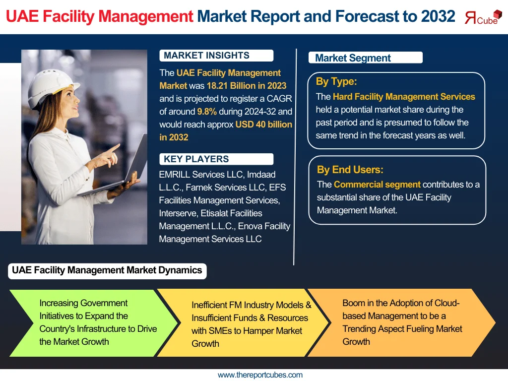 The UAE Facility Management Market was 18.21 Billion in 2023 and is projected to register a CAGR of around 9.8% during the forecast period, i.e., 2024-32 and would reach approx USD 40 billion in 2032.