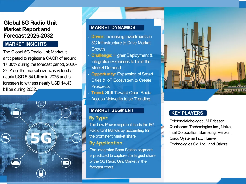 The Global 5G Radio Unit Market is anticipated to register a CAGR of around 17.30% during the forecast period, 2026-32. Also, the market size was valued at nearly USD 5.54 billion in 2025 and is foreseen to witness nearly USD 14.43 billion during 2032.