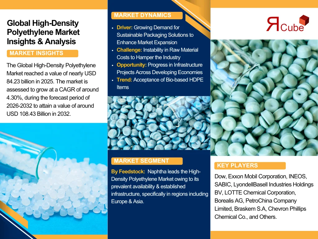The Report Cube which is one of the leading market research company in UAE expects the High-Density Polyethylene Market to grow at a CAGR of around 4.30% through 2032, as highlighted in their latest research report. The study provides an in-depth analysis of the emerging trends shaping the High-Density Polyethylene Market and offers detailed forecasts for its potential growth during 2026–2032. The report also presents a comprehensive assessment of the competitive landscape, including profiles of leading players, their performance metrics, and recent strategic developments. Additionally, it explores the key market drivers, challenges, opportunities, and provides insights into historical and future revenue trends at the global, regional, and country levels.