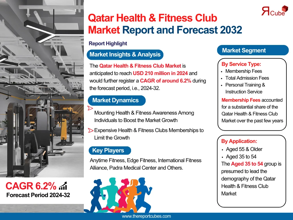 The Qatar Health & Fitness Club Market is anticipated to reach USD 210 million in 2024 and would further register a CAGR of around 6.2% during the forecast period, i.e., 2024-32.