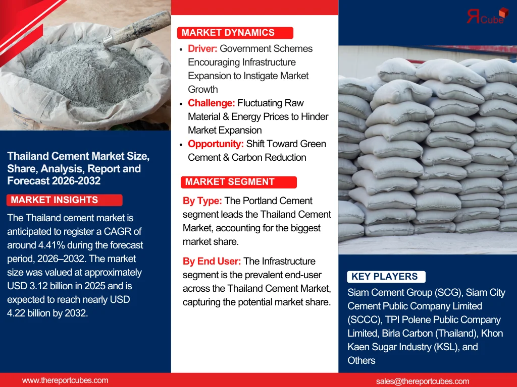 The Report Cube which is one of the leading market research company in UAE expects the Thailand Cement Market to grow at a CAGR of around 4.41% through 2032, as highlighted in their latest research report. The study provides an in-depth analysis of the emerging trends shaping the Thailand Cement Market and offers detailed forecasts for its potential growth during 2025–2032. The report also presents a comprehensive assessment of the competitive landscape, including profiles of leading players, their performance metrics, and recent strategic developments. Additionally, it explores the key market drivers, challenges, opportunities, and provides insights into historical and future revenue trends at the global, regional, and country levels.