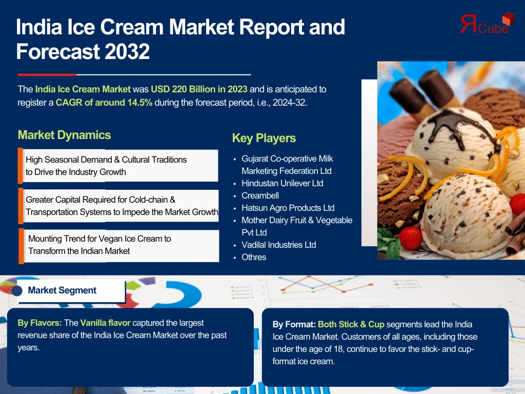 The India Ice Cream Market was USD 220 Billion in 2023 and is anticipated to register a CAGR of around 14.5% during the forecast period, i.e., 2024-32.