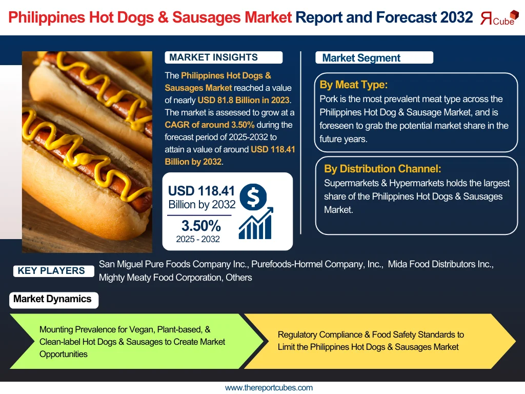 The Report Cube which is one of the leading market research company in UAE expects the Philippines Hot Dogs & Sausages Market to grow at a CAGR of around 3.50% through 2032, as highlighted in their latest research report. The study provides an in-depth analysis of the emerging trends shaping the Philippines Hot Dogs & Sausages Market and offers detailed forecasts for its potential growth during 2025–2032. The report also presents a comprehensive assessment of the competitive landscape, including profiles of leading players, their performance metrics, and recent strategic developments. Additionally, it explores the key market drivers, challenges, opportunities, and provides insights into historical and future revenue trends at the global, regional, and country levels.
