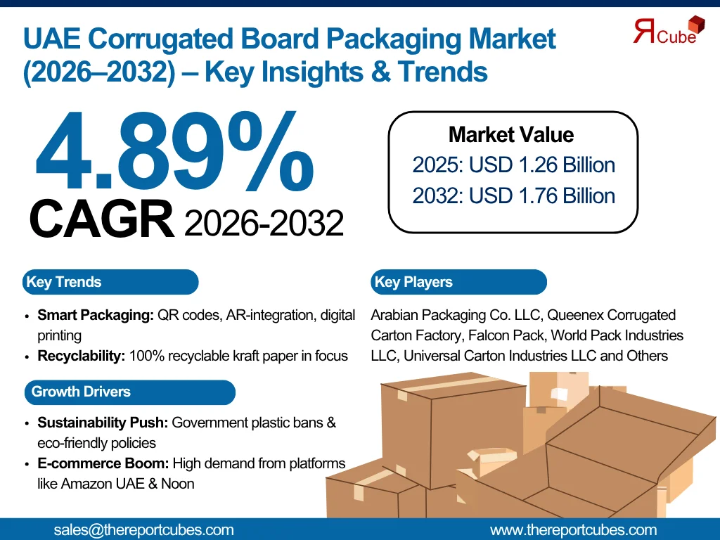 The Report Cube which is one of the leading market research company in UAE expects the UAE Corrugated Board Packaging Market to grow at a CAGR of around 4.89% through 2032, as highlighted in their latest research report. The study provides an in-depth analysis of the emerging trends shaping the UAE Corrugated Board Packaging Market and offers detailed forecasts for its potential growth during 2026–2032. The report also presents a comprehensive assessment of the competitive landscape, including profiles of leading players, their performance metrics, and recent strategic developments. Additionally, it explores the key market drivers, challenges, opportunities, and provides insights into historical and future revenue trends at the global, regional, and country levels.