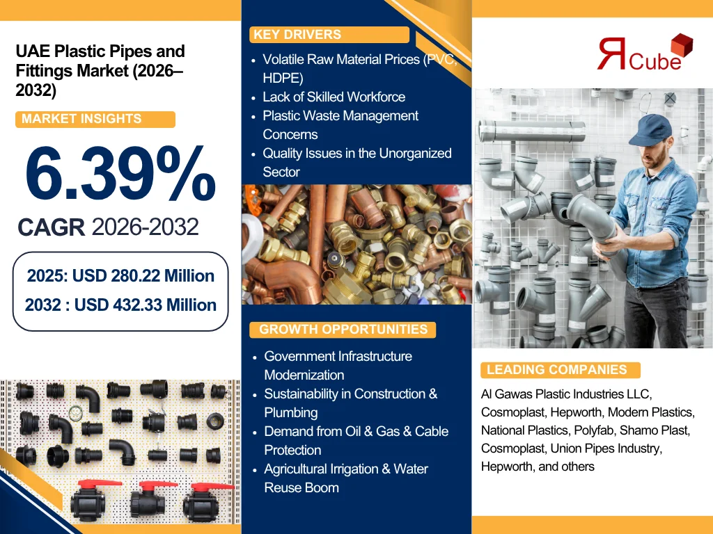 The Report Cube which is one of the leading market research company in UAE expects the UAE Plastic Pipes and Fittings Market to grow at a CAGR of around 6.39% through 2032, as highlighted in their latest research report. The study provides an in-depth analysis of the emerging trends shaping the UAE Plastic Pipes and Fittings Market and offers detailed forecasts for its potential growth during 2026–2032. The report also presents a comprehensive assessment of the competitive landscape, including profiles of leading players, their performance metrics, and recent strategic developments. Additionally, it explores the key market drivers, challenges, opportunities, and provides insights into historical and future revenue trends at the global, regional, and country levels.