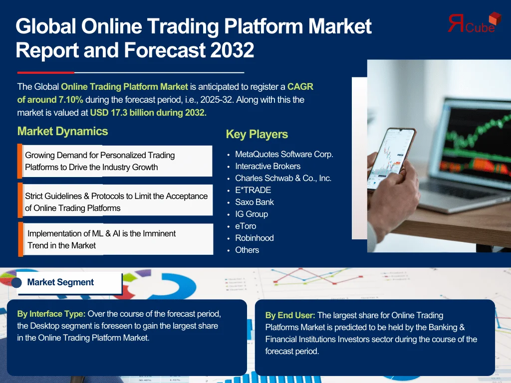 The Global Online Trading Platform Market size was valued at USD 10.70 billion in 2025, further projected to be about USD 17.3 by 2032, and would register a CAGR of around 7.10% during 2025-32.
