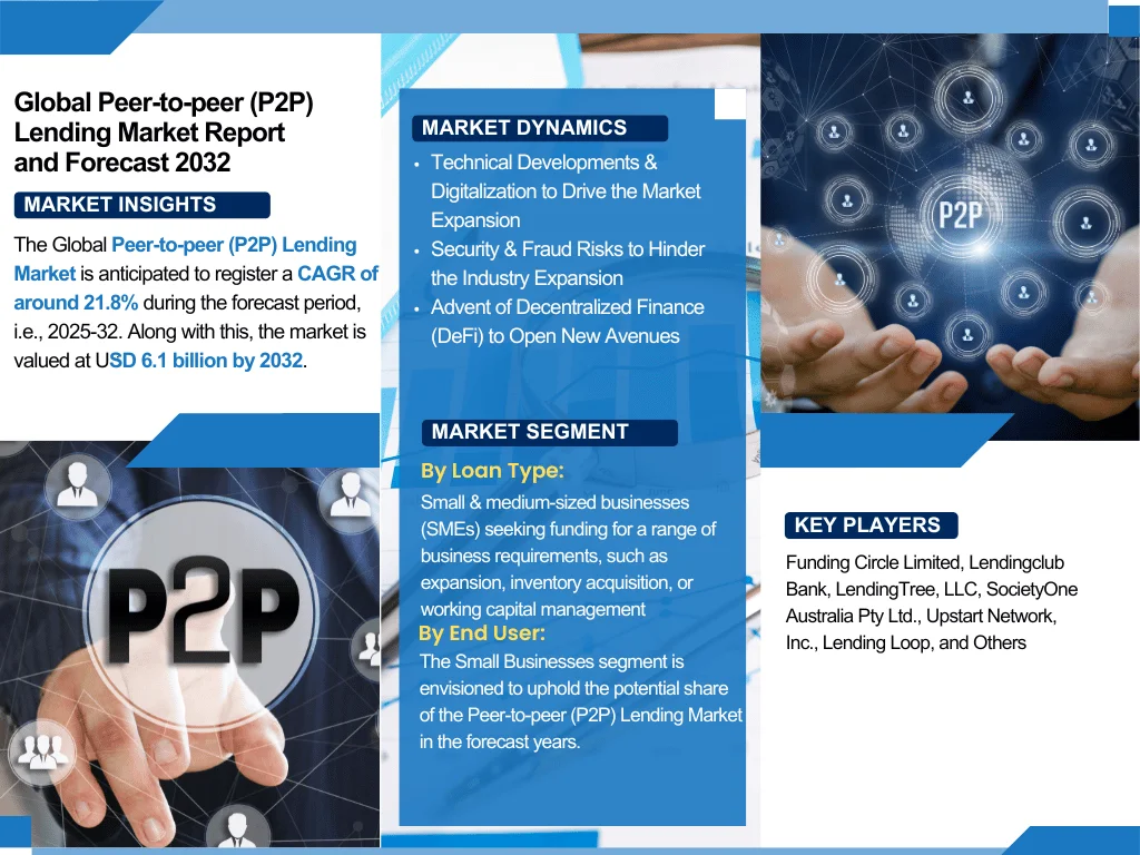 The Global Peer-to-peer (P2P) Lending Market size was valued at USD 1.53 billion in 2025, further projected to be about USD 6.1 billion by 2032, and would register a CAGR of around 21.8% during 2025-32.