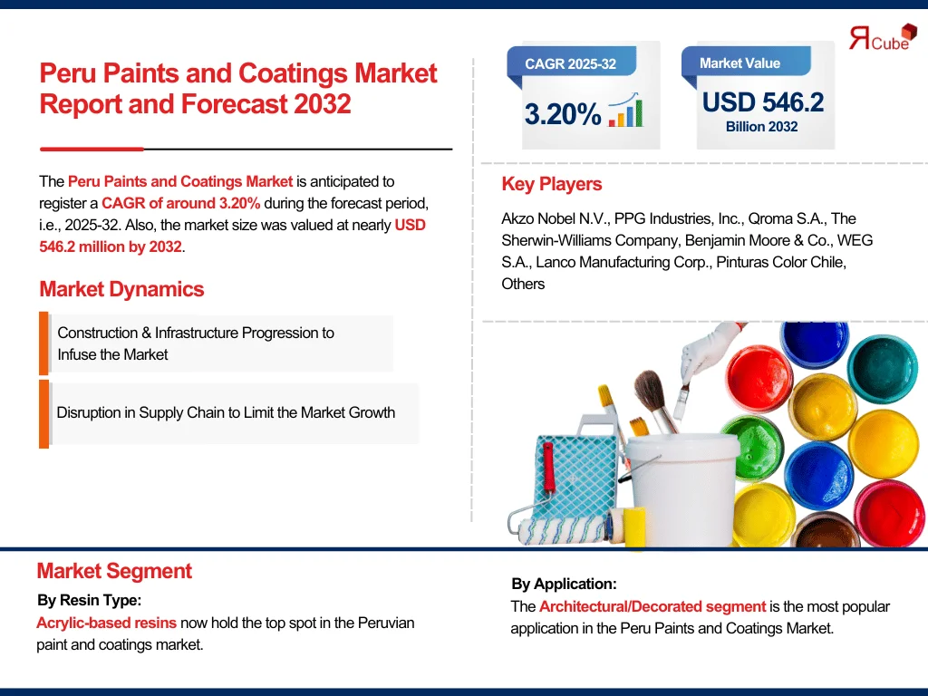 The Peru Paints and Coatings Market is anticipated to register a CAGR of around 3.20% during the forecast period, i.e., 2025-32.