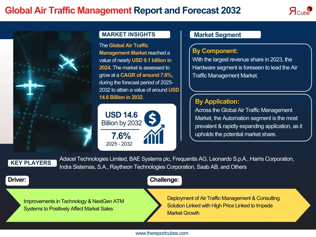 The Global Air Traffic Management Market reached a value of nearly USD 9.80 billion in 2025. The market is assessed to grow at a CAGR of around 7.6%, during the forecast period of 2025-2032 to attain a value of around USD 16.44 Billion in 2032.