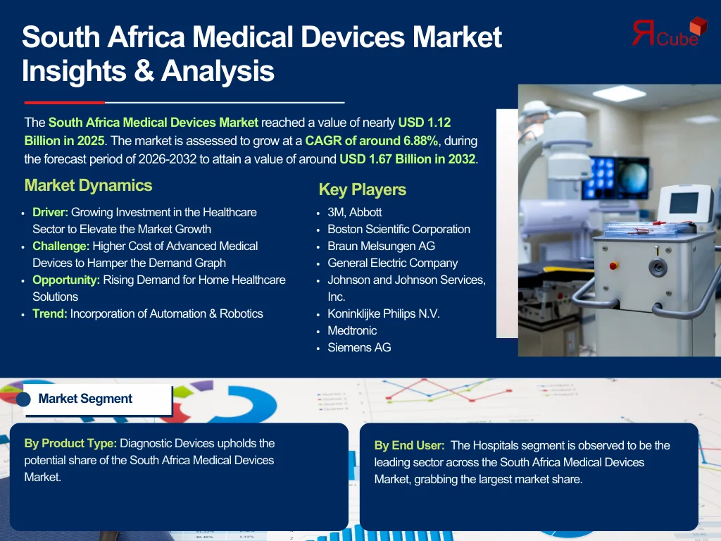 The South Africa Medical Devices Market reached a value of nearly USD 1.12 Billion in 2025. The market is assessed to grow at a CAGR of around 6.88%, during the forecast period of 2026-2032 to attain a value of around USD 1.67 Billion in 2032.