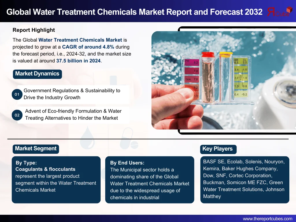 The Global Water Treatment Chemicals Market is projected to grow at a CAGR of around 4.8% during the forecast period, i.e., 2024-32, and the market size is valued at around 37.5 billion in 2024.