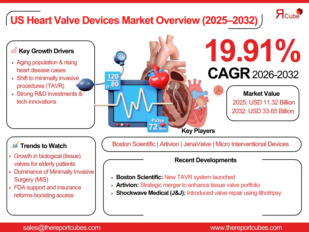 The US Heart Valve Devices Market reached a value of nearly USD 11.32 billion in 2025. The market is assessed to grow at a CAGR of around 19.91%, during the forecast period of 2026-2032 to attain a value of around USD 33.65 billion in 2032.