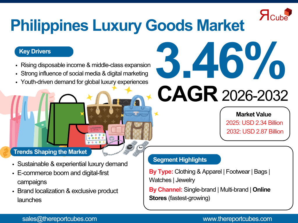 The Philippines Luxury Goods Market reached a value of nearly USD 2.34 billion in 2025. The market is assessed to grow at a CAGR of around 3.46%, during the forecast period of 2026-2032 to attain a value of around USD 2.87 billion in 2032.