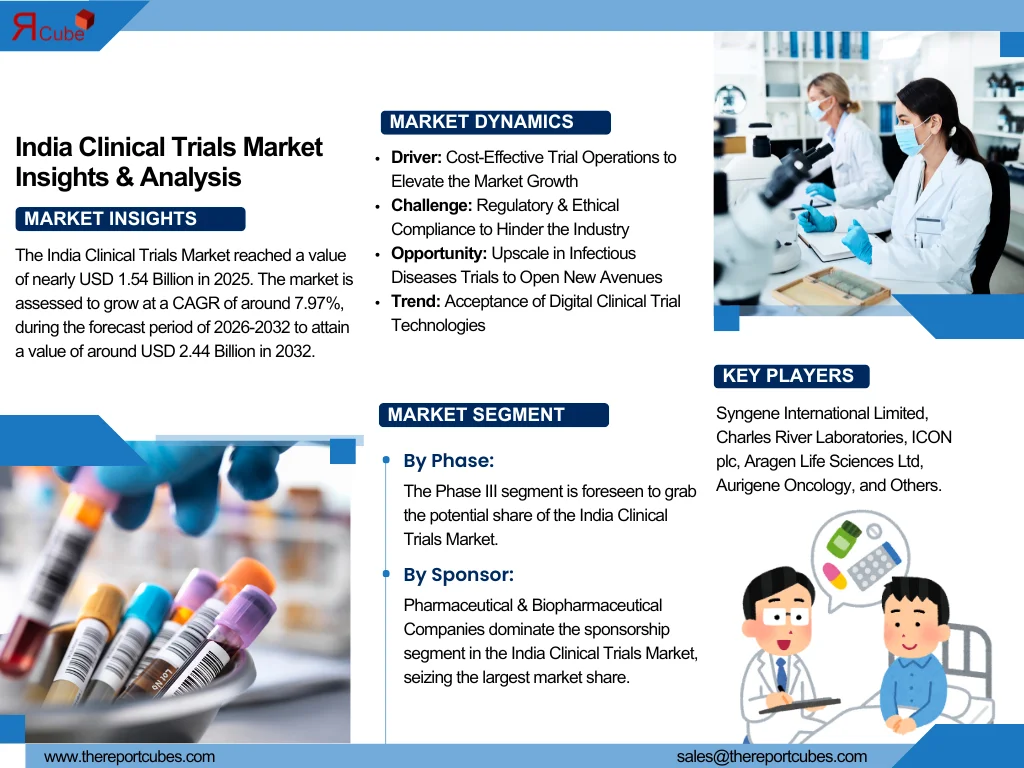 The India Clinical Trials Market reached a value of nearly USD 1.54 Billion in 2025. The market is assessed to grow at a CAGR of around 7.97%, during the forecast period of 2026-2032 to attain a value of around USD 2.44 Billion in 2032.