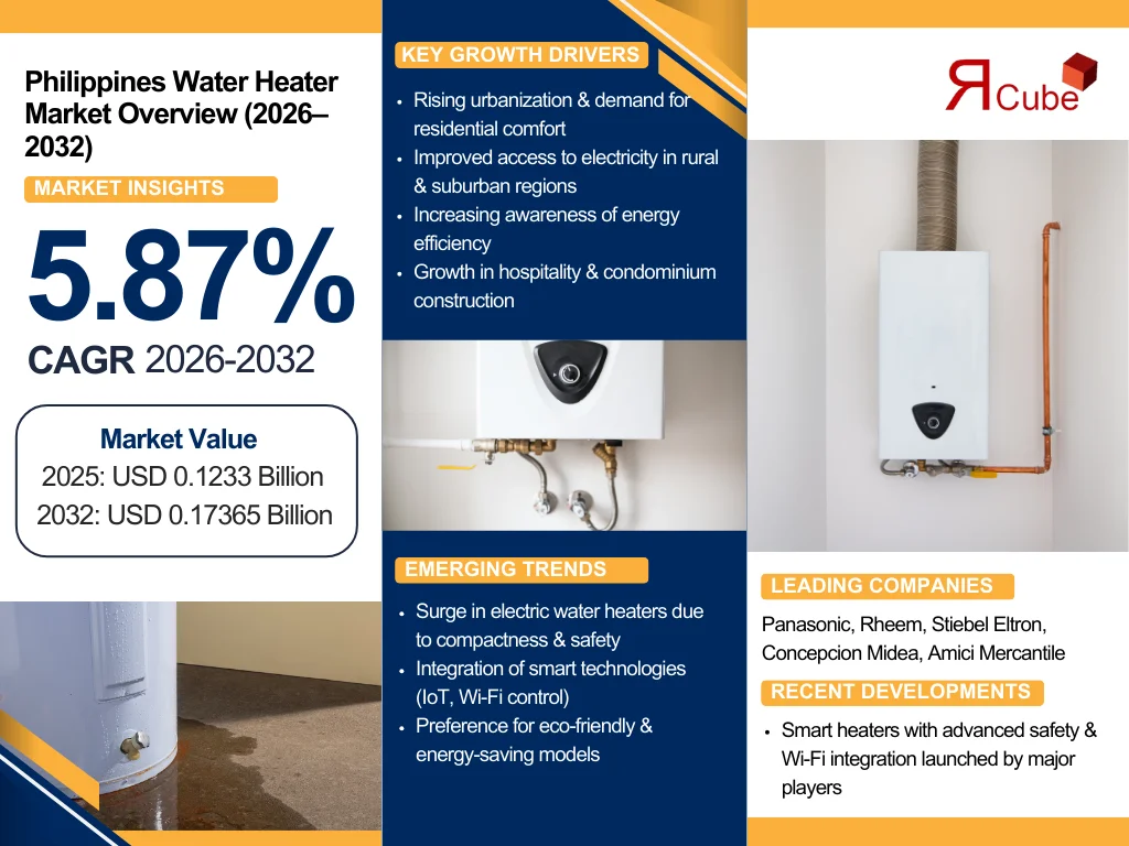 The Philippines Water Heater Market reached a value of nearly USD 0.1233 Billion in 2025. The market is assessed to grow at a CAGR of around 5.87%, during the forecast period of 2026-2032 to attain a value of around USD 0.17365 Billion in 2032.