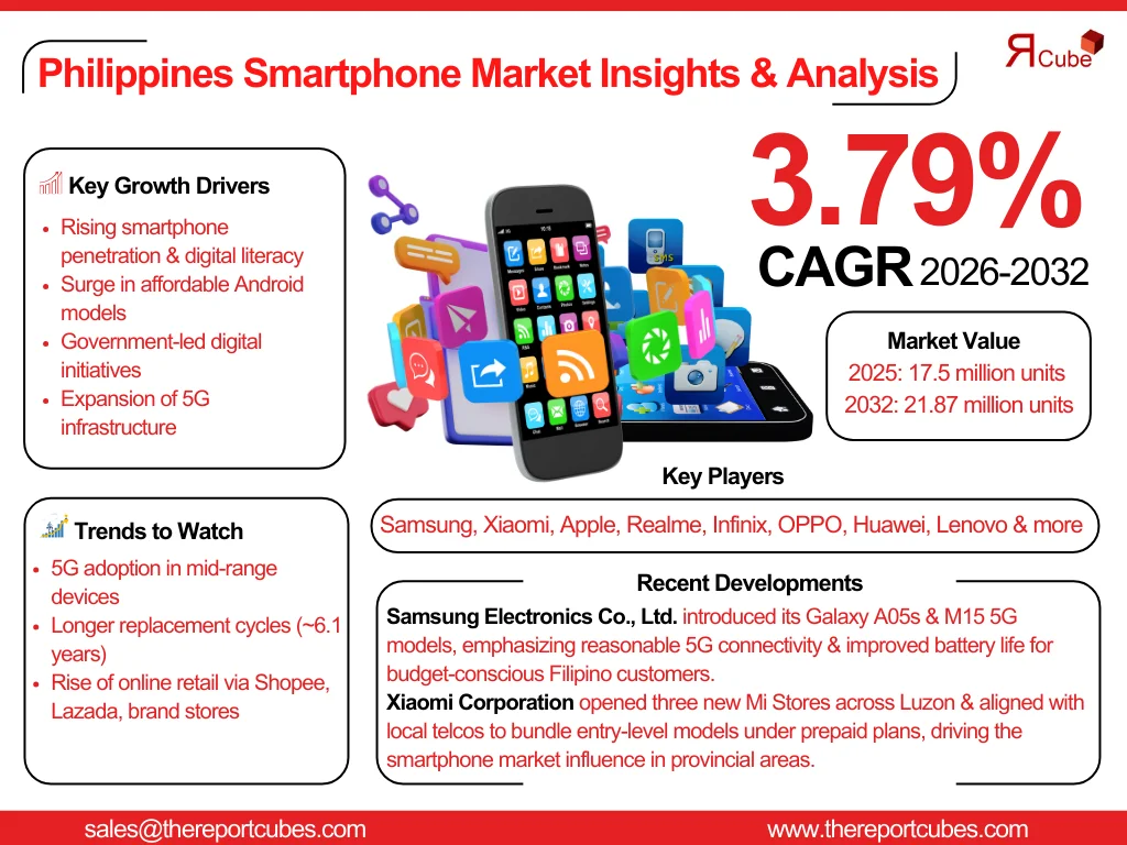 The Philippines Smartphone Market reached a value of nearly USD 17.5 million units in 2025. The market is assessed to grow at a CAGR of around 3.79%, during the forecast period of 2026-2032 to attain a value of around USD 21.87 million units in 2032.