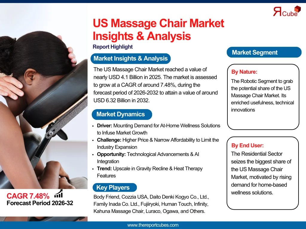 The US Massage Chair Market reached a value of nearly USD 4.1 Billion in 2025. The market is assessed to grow at a CAGR of around 7.48%, during the forecast period of 2026-2032 to attain a value of around USD 6.32 Billion in 2032.