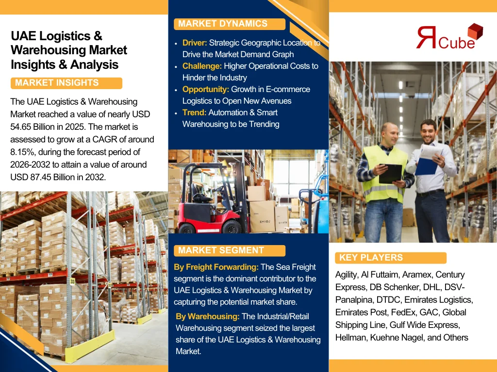 The UAE Logistics & Warehousing Market reached a value of nearly USD 54.65 Billion in 2025. The market is assessed to grow at a CAGR of around 8.15%, during the forecast period of 2026-2032 to attain a value of around USD 87.45 Billion in 2032.