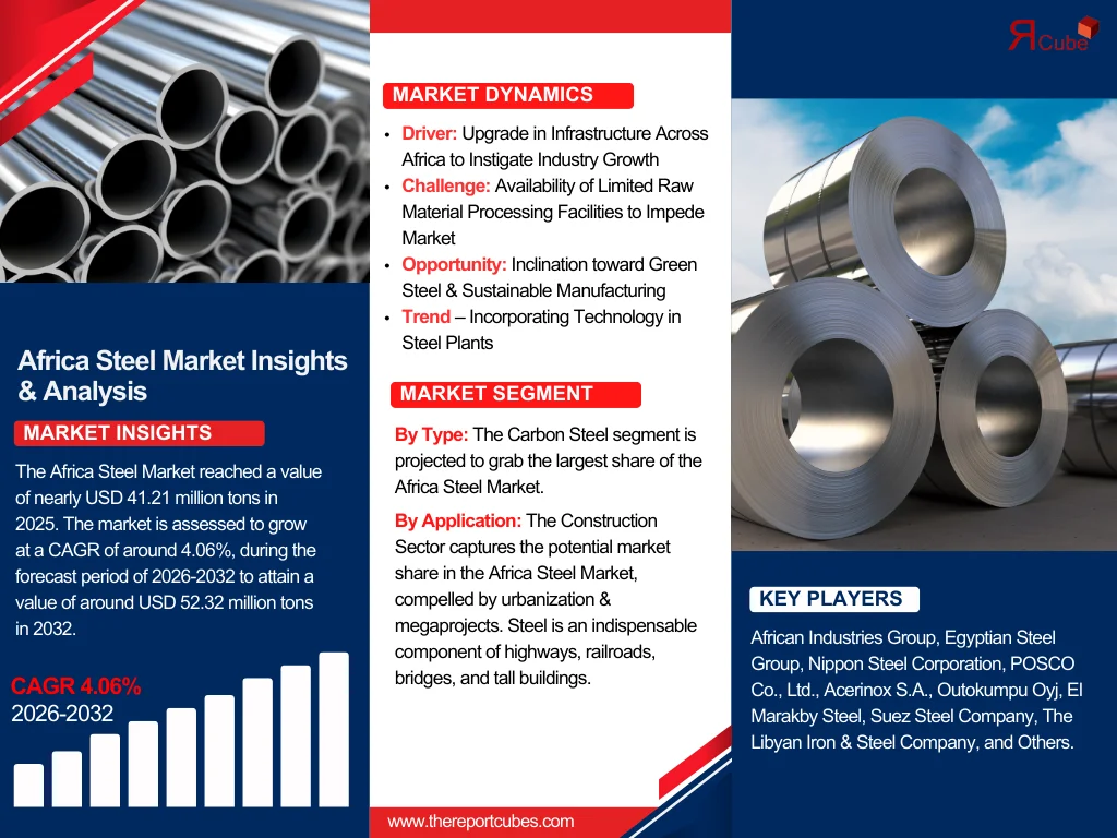 The Africa Steel Market reached a value of nearly 41.21 million tons in 2025. The market is assessed to grow at a CAGR of around 4.06%, during the forecast period of 2026-2032 to attain a value of around 52.32 million tons in 2032.