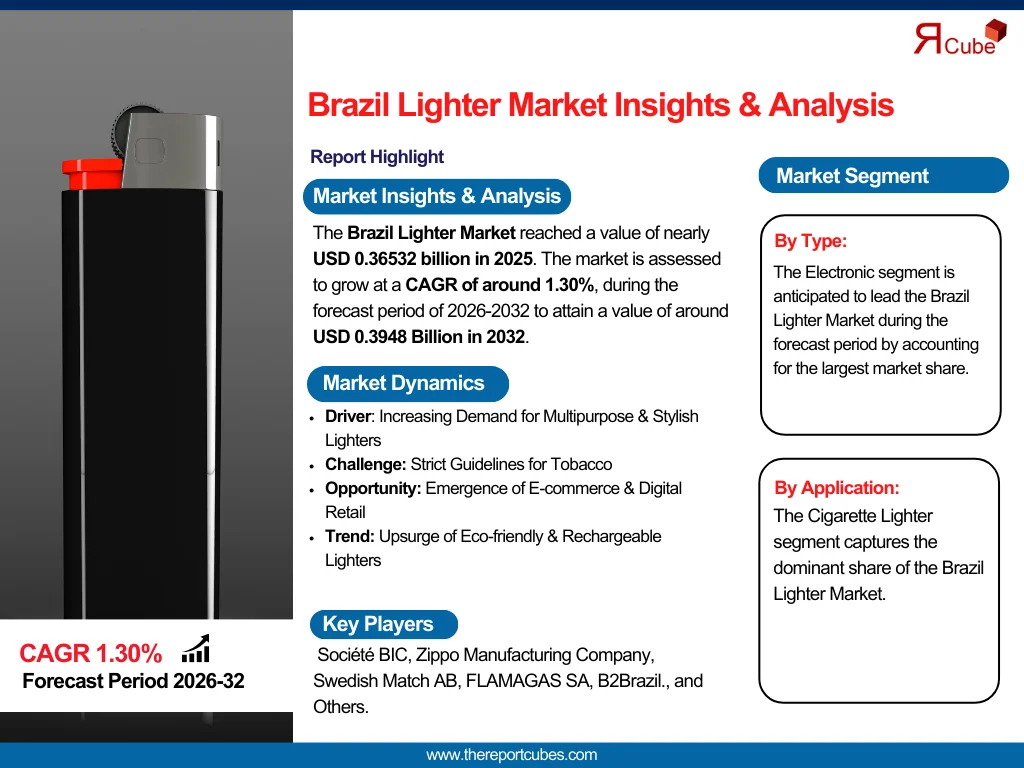 The Brazil Lighter Market reached a value of nearly USD 0.36532 billion in 2025. The market is assessed to grow at a CAGR of around 1.30%, during the forecast period of 2026-2032 to attain a value of around USD 0.3948 Billion in 2032.
