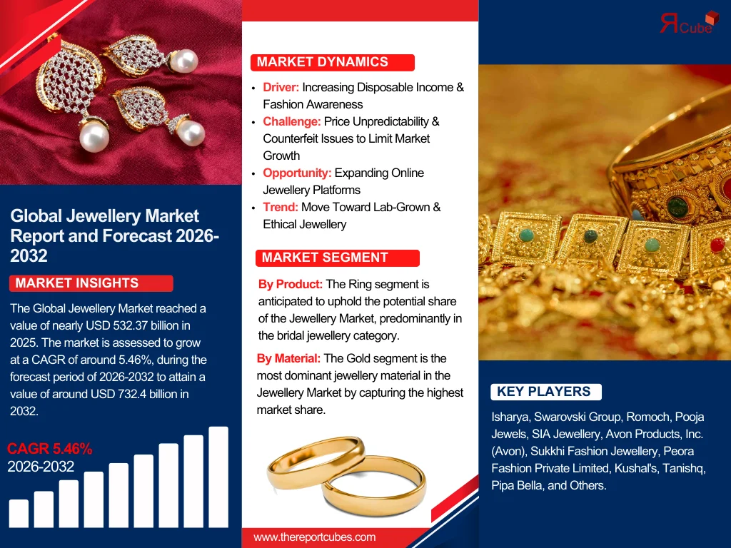 The Global Jewellery Market reached a value of nearly USD 532.37 billion in 2025. The market is assessed to grow at a CAGR of around 5.46%, during the forecast period of 2026-2032 to attain a value of around USD 732.4 billion in 2032.