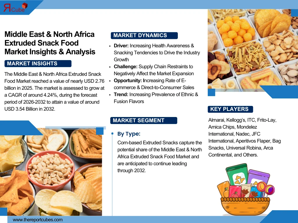 The Middle East & North Africa Extruded Snack Food Market reached a value of nearly USD 2.76 Billion in 2025. The market is assessed to grow at a CAGR of around 4.24%, during the forecast period of 2026-2032 to attain a value of around USD 3.54 Billion in 2032.