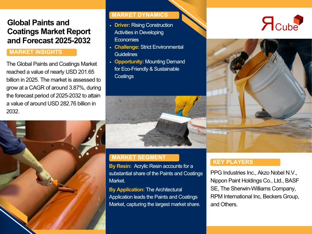The Global Paints and Coatings Market reached a value of nearly USD 201.65 billion in 2025. The market is assessed to grow at a CAGR of around 3.87%, during the forecast period of 2025-2032 to attain a value of around USD 282.76 billion in 2032.