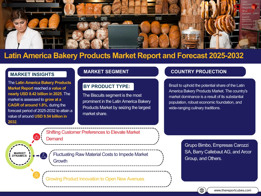The Latin America Bakery Products Market Report reached a value of nearly USD 8.42 billion in 2025. The market is assessed to grow at a CAGR of around 1.8%, during the forecast period of 2025-2032 to attain a value of around USD 9.54 billion in 2032.
