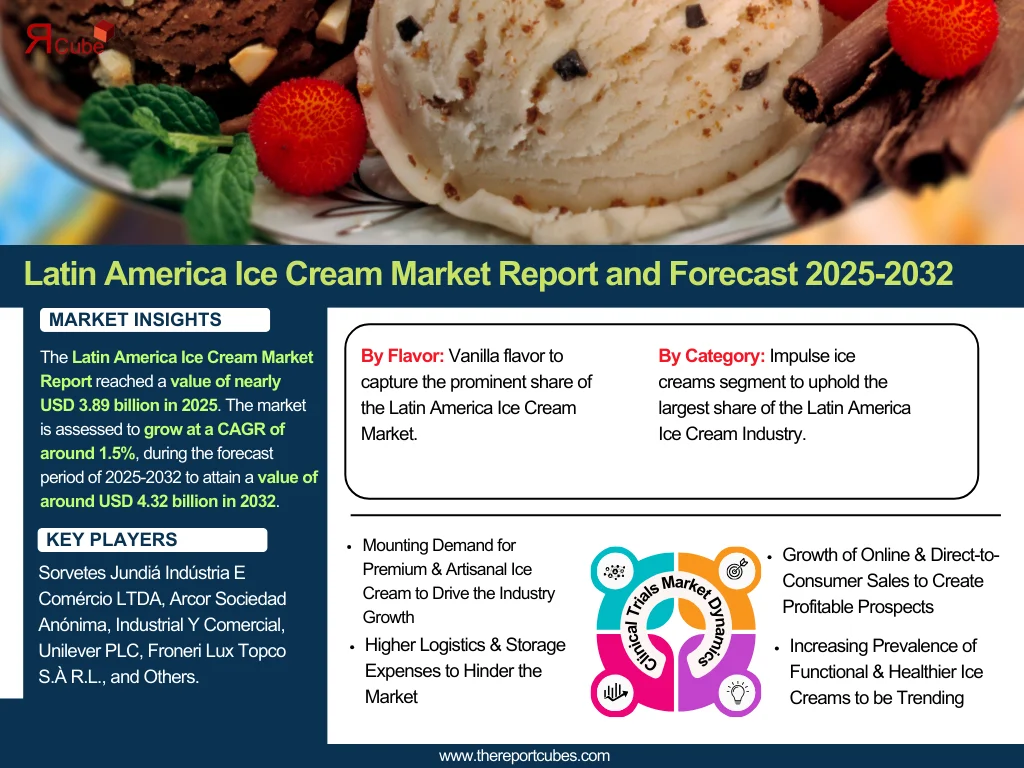 The Latin America Ice Cream Market Report reached a value of nearly USD 3.89 billion in 2025. The market is assessed to grow at a CAGR of around 1.5%, during the forecast period of 2025-2032 to attain a value of around USD 4.32 billion in 2032.