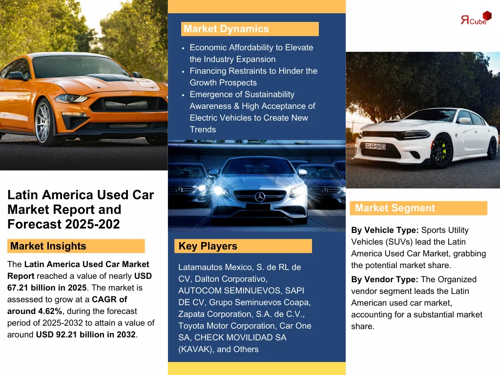 The Latin America Used Car Market Report reached a value of nearly USD 67.21 billion in 2025. The market is assessed to grow at a CAGR of around 4.62%, during the forecast period of 2025-2032 to attain a value of around USD 92.21 billion in 2032.