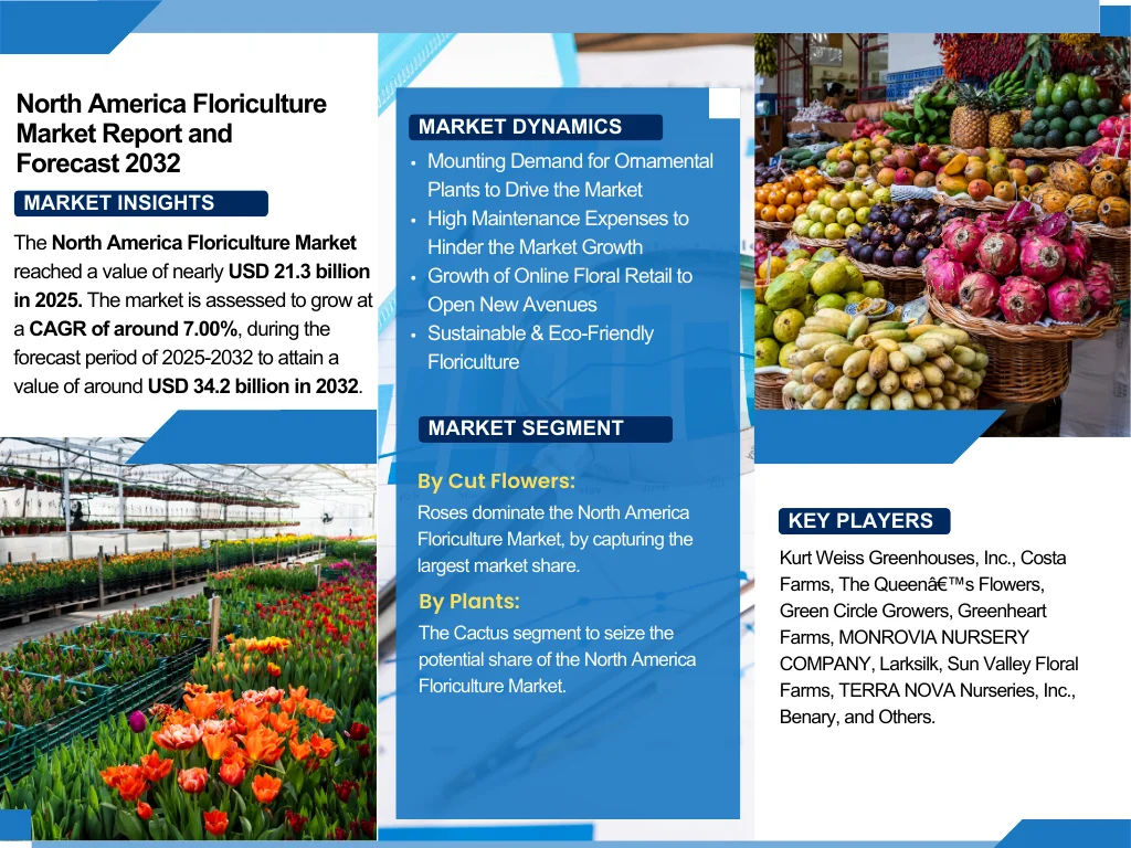 The credible North America Floriculture Market report covers detailed insights into market size, share, trends, and opportunities. This research helps businesses make informed decisions, strengthen their strategies, and expand their reach in a competitive landscape. The analysis estimates market growth based on evolving dynamics and demand drivers.