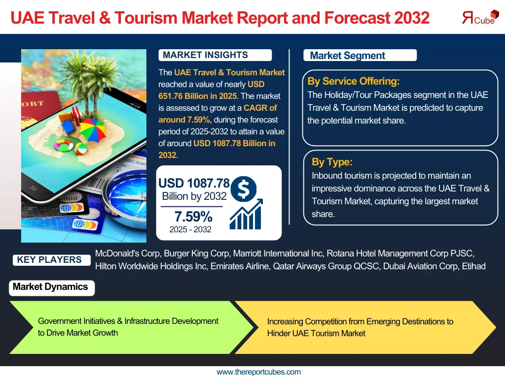 The UAE Travel & Tourism Market reached a value of nearly USD 651.76 Billion in 2025. The market is assessed to grow at a CAGR of around 7.59%, during the forecast period of 2025-2032 to attain a value of around USD 1087.78 Billion in 2032.