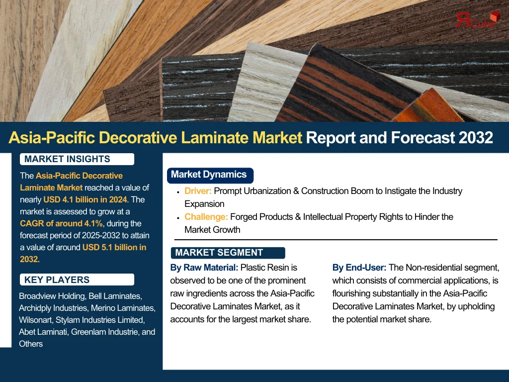 The Asia-Pacific Decorative Laminate Market reached a value of nearly USD 4.1 billion in 2024. The market is assessed to grow at a CAGR of around 4.1%, during the forecast period of 2025-2032 to attain a value of around USD 5.1 billion in 2032.