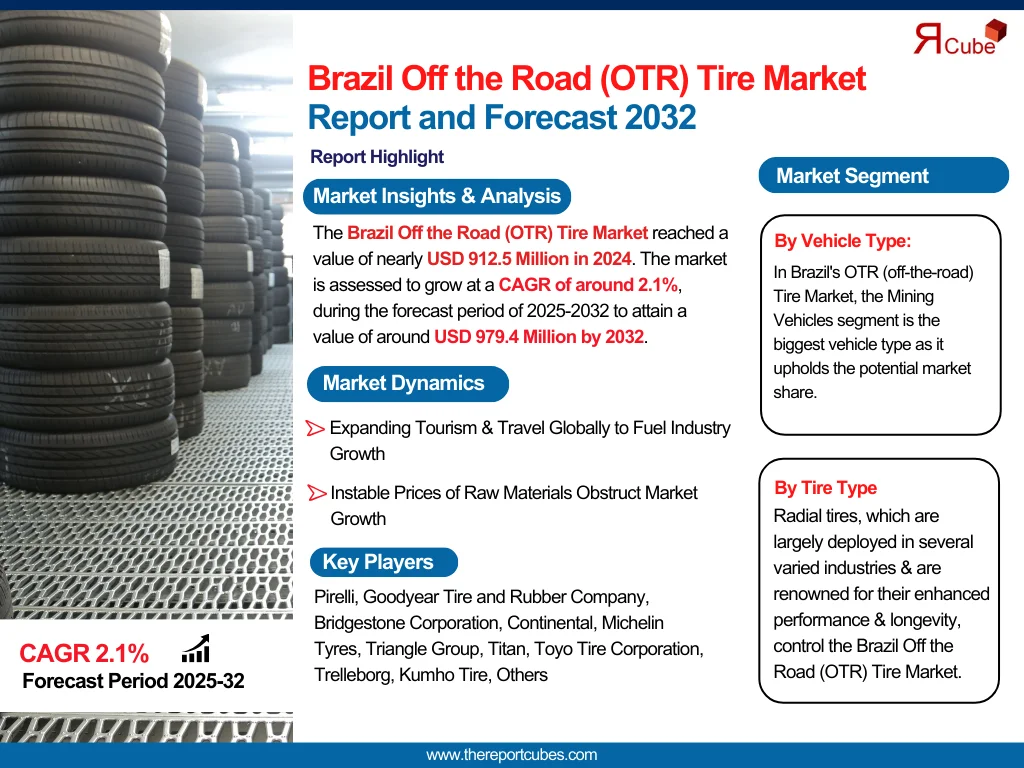 The Brazil Off the Road (OTR) Tire Market reached a value of nearly USD 912.5 Million in 2024. The market is assessed to grow at a CAGR of around 2.1%, during the forecast period of 2025-2032 to attain a value of around USD 979.4 Million by 2032.