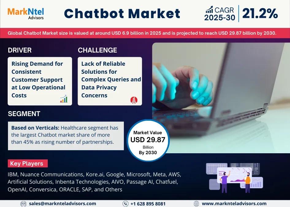 MarkNtel Advisors, a leading market research and consulting firm, has announced the release of its latest study titled Chatbot Market Research Report: Forecast (2025–2030). This report provides a detailed assessment of the Chatbot, covering its evolving dynamics, emerging trends, key growth drivers, major challenges, and competitive landscape.