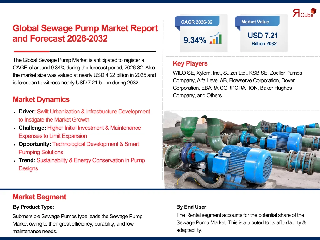The Sewage Pump Market is anticipated to register a CAGR of around 9.34% during the forecast period, 2026-32. Also, the market size was valued at nearly USD 4.22 billion in 2025 and is foreseen to witness nearly USD 7.21 billion during 2032.