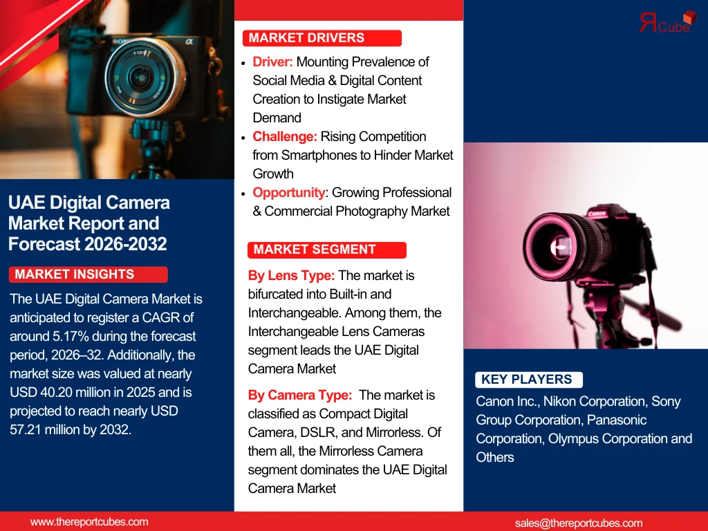 The UAE Digital Camera Market is anticipated to register a CAGR of around 5.17% during the forecast period, 2026–32. Additionally, the market size was valued at nearly USD 40.20 million in 2025 and is projected to reach nearly USD 57.21 million by 2032.