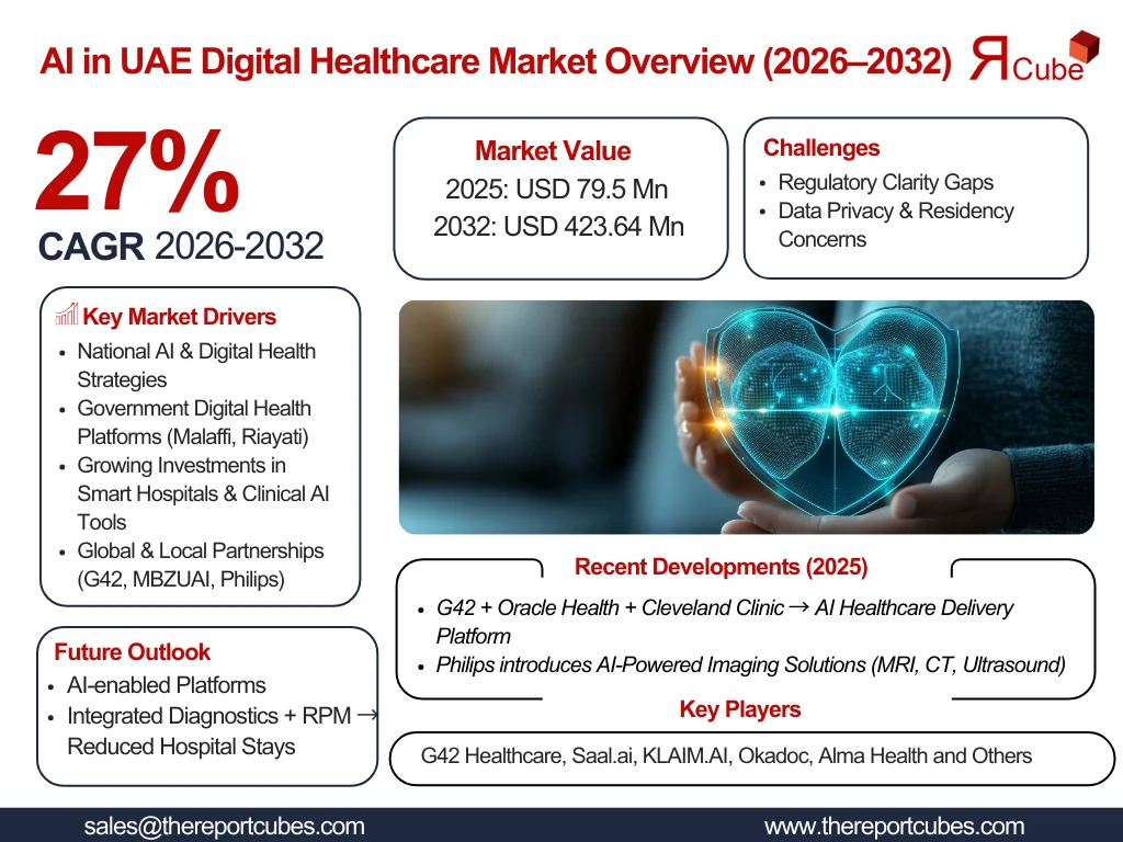 The AI in UAE Digital Healthcare Market is anticipated to register a CAGR of around 27% during the forecast period, 2026-32. Additionally, the market size was valued at nearly USD 79.5 million in 2025 and is projected to reach nearly USD 423.64 million by 2032.