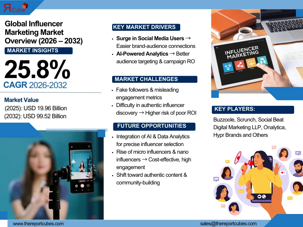 The Influencer Marketing Market is anticipated to register a CAGR of around 25.8% during the forecast period 2026–2032. Also, the market size was valued at nearly USD 19.96 billion in 2025 and is projected to reach USD 99.52 billion by 2032.