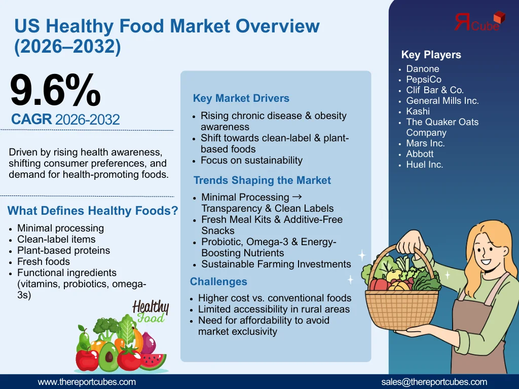 The US Healthy Food Market is projected to register a CAGR of around 9.6% during the forecast period 2026–2032. This is compelled by shifting customer preferences, increasing health consciousness, and the surging demand for foods that provide health benefits beyond basic nutrition.
