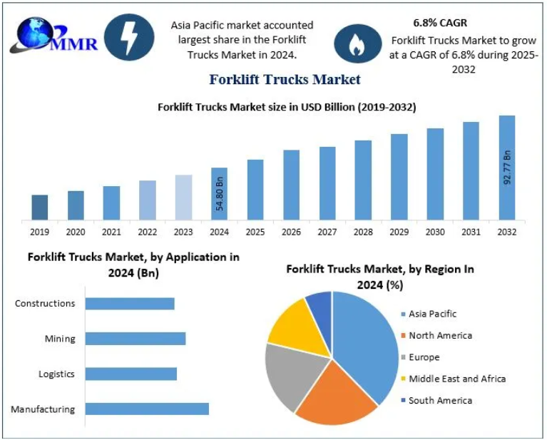 The Forklift Trucks Market, valued at USD 54.80 billion in 2024, is poised for strong expansion and is projected to reach USD 92.77 billion by 2032, accelerating at a CAGR of 6.8% from 2025 to 2032. Forklift trucks continue to be an indispensable part of industrial logistics, thanks to their efficiency in handling heavy loads, optimizing warehouse operations, and enabling seamless movement of goods across short distances.