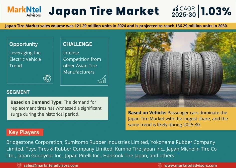 MarkNtel Advisors, a leading market research and consulting firm, has announced the release of its latest study titled Japan Tire Market Research Report: Forecast (2025–2030). This report provides a detailed assessment of the Japan Tire, covering its evolving dynamics, emerging trends, key growth drivers, major challenges, and competitive landscape.