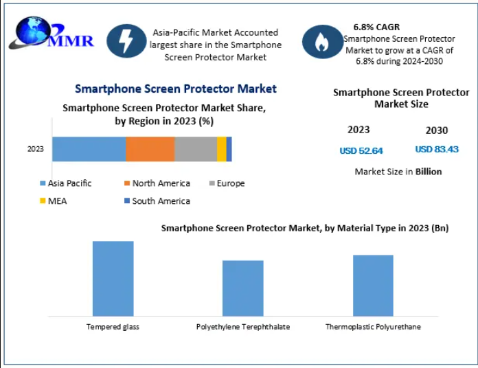 The Smartphone Screen Protector Market is poised for steady expansion, projected to grow at a CAGR of 6.8% during the forecast period and reach an estimated USD 83.43 billion by 2030, up from USD 52.64 billion in 2023. The market’s strong growth trajectory is primarily driven by increasing smartphone penetration, rising digitalization, and greater consumer awareness of device protection.